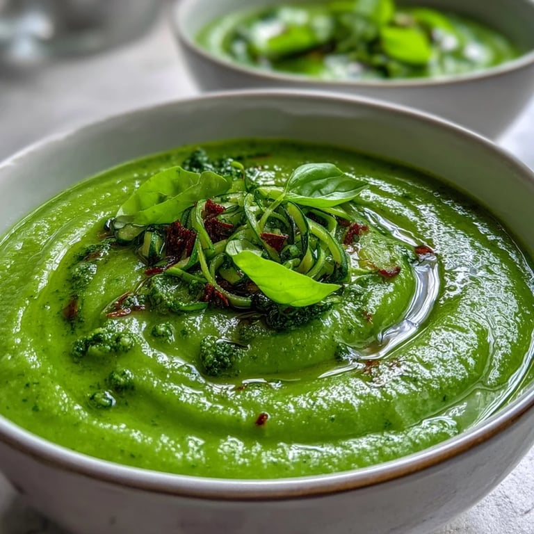 Save Embrace the vibrant flavors of European cuisine with this spring-inspired Courgette, Pea and Pesto Soup. Brimming with fresh courgettes and sweet peas, this dish offers a light yet deeply satisfying meal that perfectly celebrates the arrival of the season.