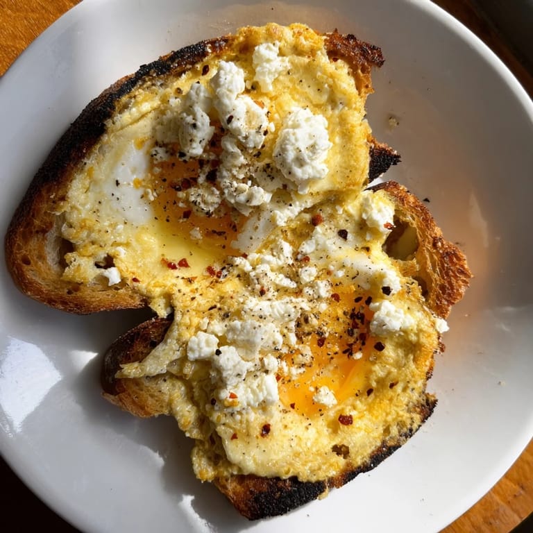 A flimsy white bread will get soggy from the runny yolk and fall apart when you bite into it. Sourdough or country bread has enough structure to hold everything together while still getting crispy and golden on the outside. The slight tang in sourdough also plays beautifully against the salty feta and runny egg—it's a flavor combination that feels both balanced and rich.