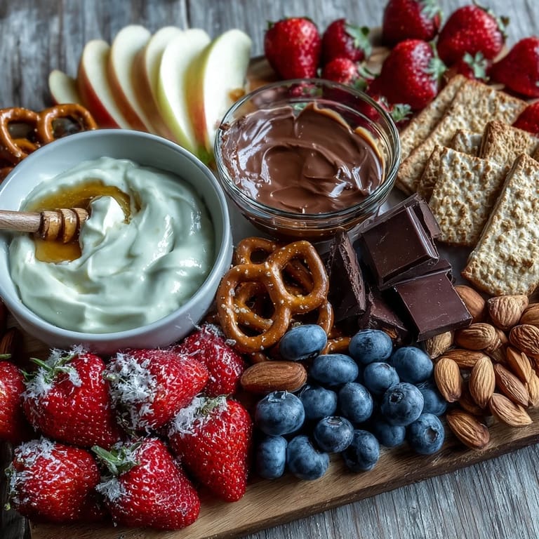 Save The real star of this board is the creamy yogurt dip—a simple blend of Greek yogurt sweetened with honey and brightened with fresh lemon zest and vanilla. It pairs beautifully with the fresh fruit while also complementing the savory pretzels and graham crackers. The combination of fresh strawberries, grapes, apple slices, and blueberries creates a rainbow of colors that's as pleasing to the eye as it is to the palate. Add in the indulgent touch of dark chocolate squares and crunchy almonds, and you have a complete snacking experience that satisfies every craving.
