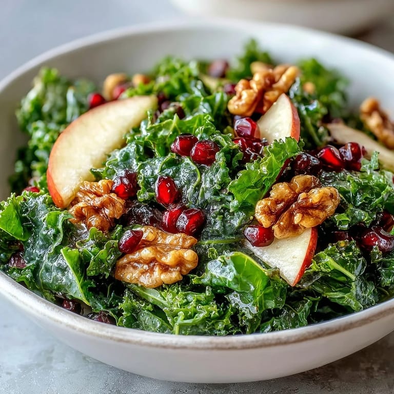 The real magic here is in the proportion and the order in which everything comes together. The kale is your foundation—once it's massaged and tender, it becomes almost sweet on its own. The apple and pomegranate are your bright spots that add both flavor and visual excitement, while the walnuts provide an earthy anchor. The dressing is just enough to coat everything without drowning it, so you can actually taste each ingredient as it is.