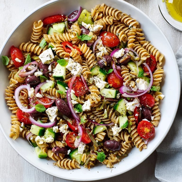 Save A vibrant, refreshing pasta salad featuring tangy feta, briny olives, ripe tomatoes, and crisp vegetables—all tossed in a zesty olive oil dressing. The perfect light Mediterranean-inspired plate for warm weeknight dinners.