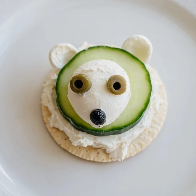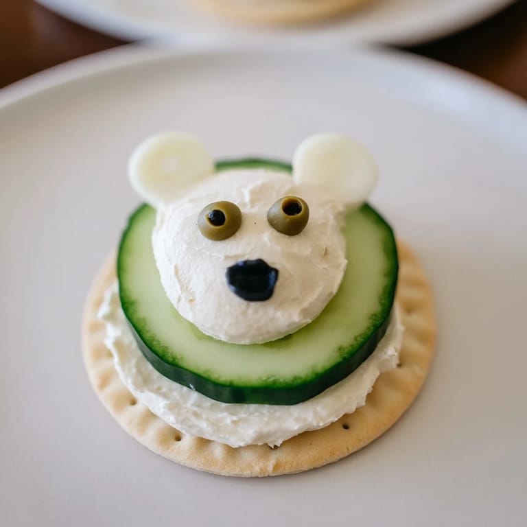 - Using a small spoon or piping bag, drop a rounded mound of cream cheese mixture onto the cucumber slice as the polar bears head.