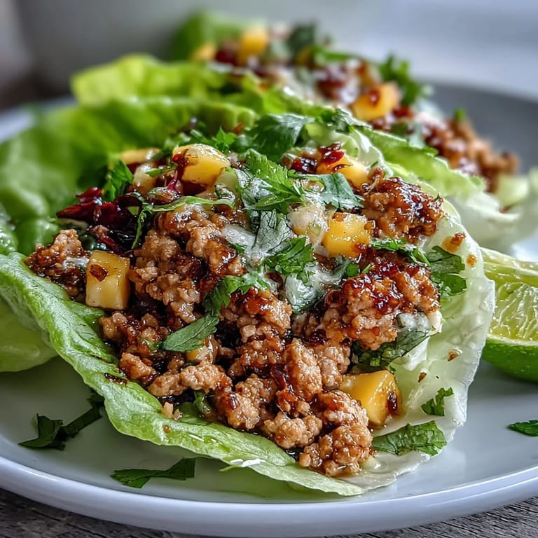 - Spoon the warm turkey into the center of each cool lettuce leaf and crown it generously with the chilled mango slaw so every bite has turkey, crunch, and brightness all at once. Serve immediately so the contrast between temperatures and textures stays sharp and satisfying.